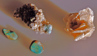 February is a wacky month of Gem, Mineral and Fossil Shows and exhibits throughout Tucson (a rodeo, too, coming next week) and so we took a ride over the Tucson Mountains to our absolutely favorite Fossil and Rock Shop on Kinney Road. I always discover something wonderful in this shop, and I so enjoy saying hi to Ron, who is a retired paleontologist from Long Island. He knows so much about fossils and minerals of the Southwest, and browsing his shop always brings alive for me the ancient earth history of this Sonoran desert.Today I chose four pieces all native to Southern Arizona and the Sonoran desert. I found a beautiful "desert rose" (made of pinkish selenite), two tiny pieces of turquiose from Bisbee, and a magnificent, tiny octahedral fluorite (formed from a mineral which came from the Silver Bell mine. So many complex crystals set in its rock!) Leigh selected another complex rock; his is a piece of quartzite.